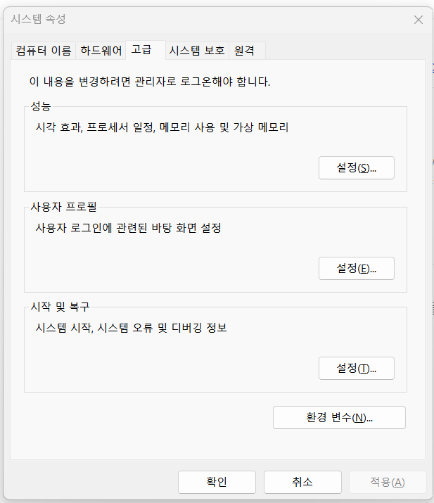 그 다음, 시스템 환경 변수 설정의 Path에 두 압출을 푼 파일의 bin 경로를 추가해준다.