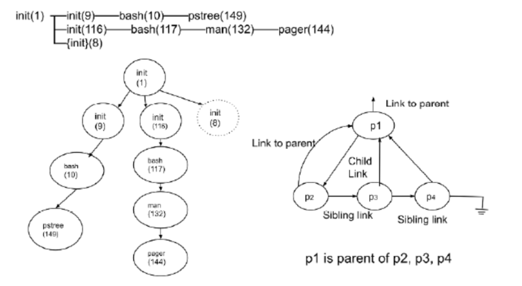 각 프로세스는 여러 가지 link를 가지게 되는데, 만약 프로세스가 부모나 자식, 형제가 없을 경우 해당 연결은 NULL 값을 가리킨다.