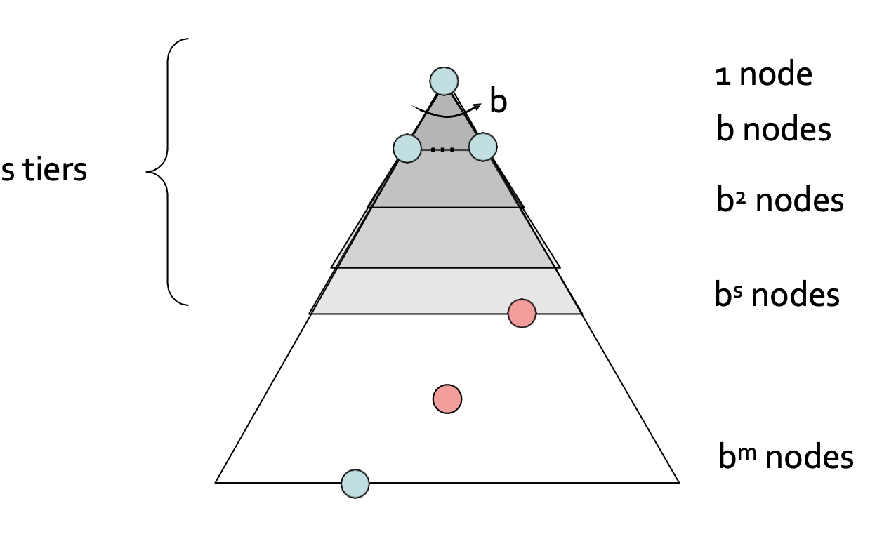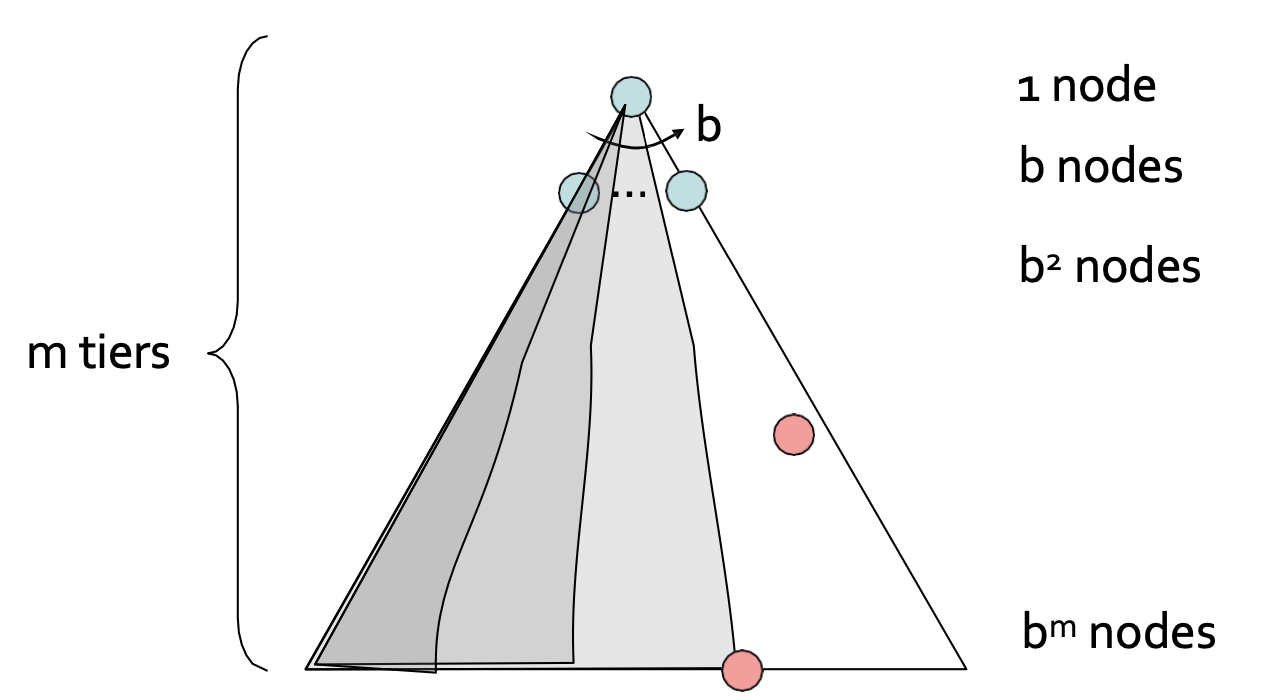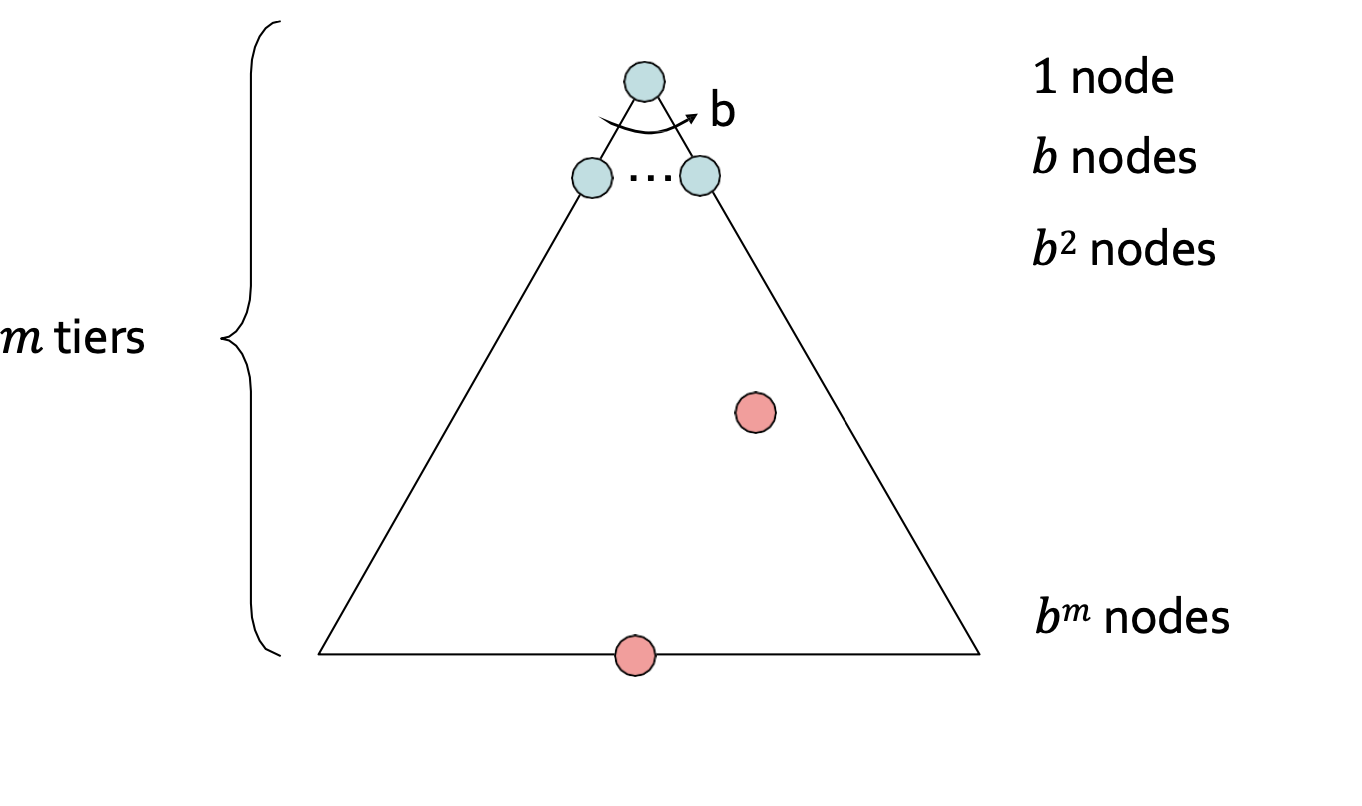 - 𝑚이 유한하면 𝑂(𝑏^𝑚)에 시간이 걸린다. (1+𝑏+𝑏^2+⋯+𝑏^𝑚=𝑂(𝑏^𝑚))