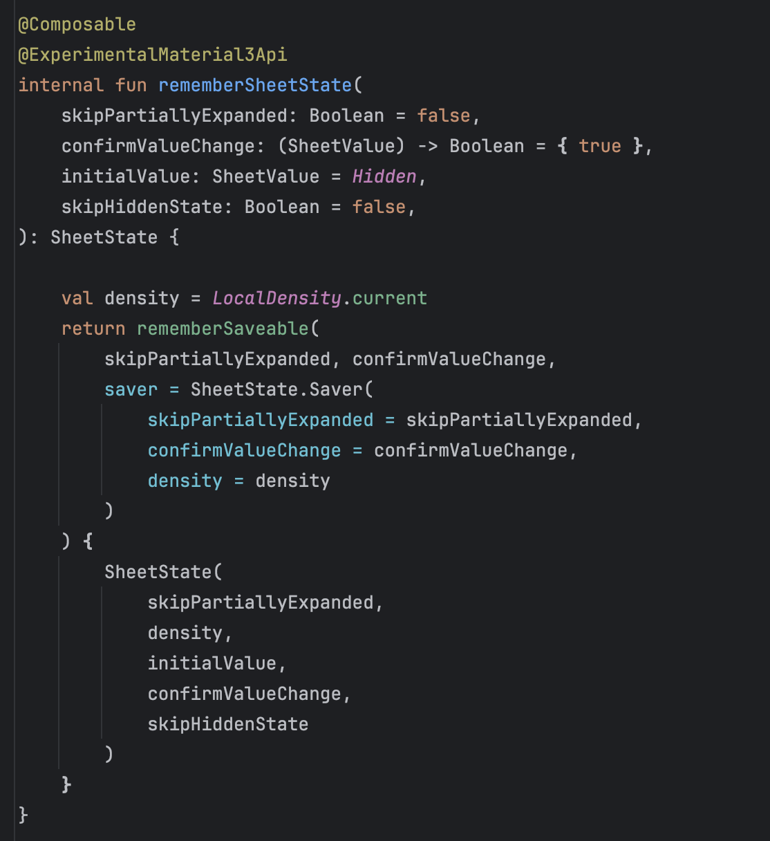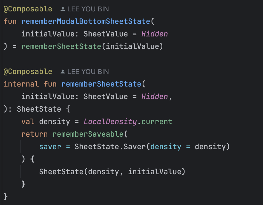 중요한 포인트는, rememberSaveable을 통해서 SheetState의 Saver 함수를 호출하여 상태가 저장되고 유지되게 해준다는 점이다.