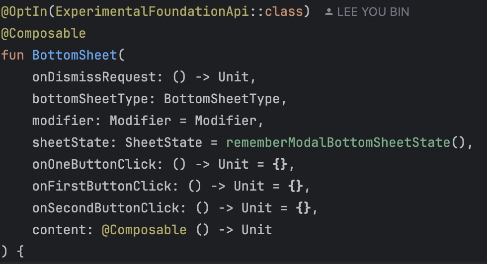 바텀시트가 닫힐 때 콜백해줘야 하는 함수인 onDismissRequest, 바텀시트 타입을 정의해줘야 하는 BottomSheetType, 바텀시트 내부 UI를 결정하는 content는 필수 매개변수로 넣어주었고, 나머지는 필요에 따라 넣도록 해줬다.