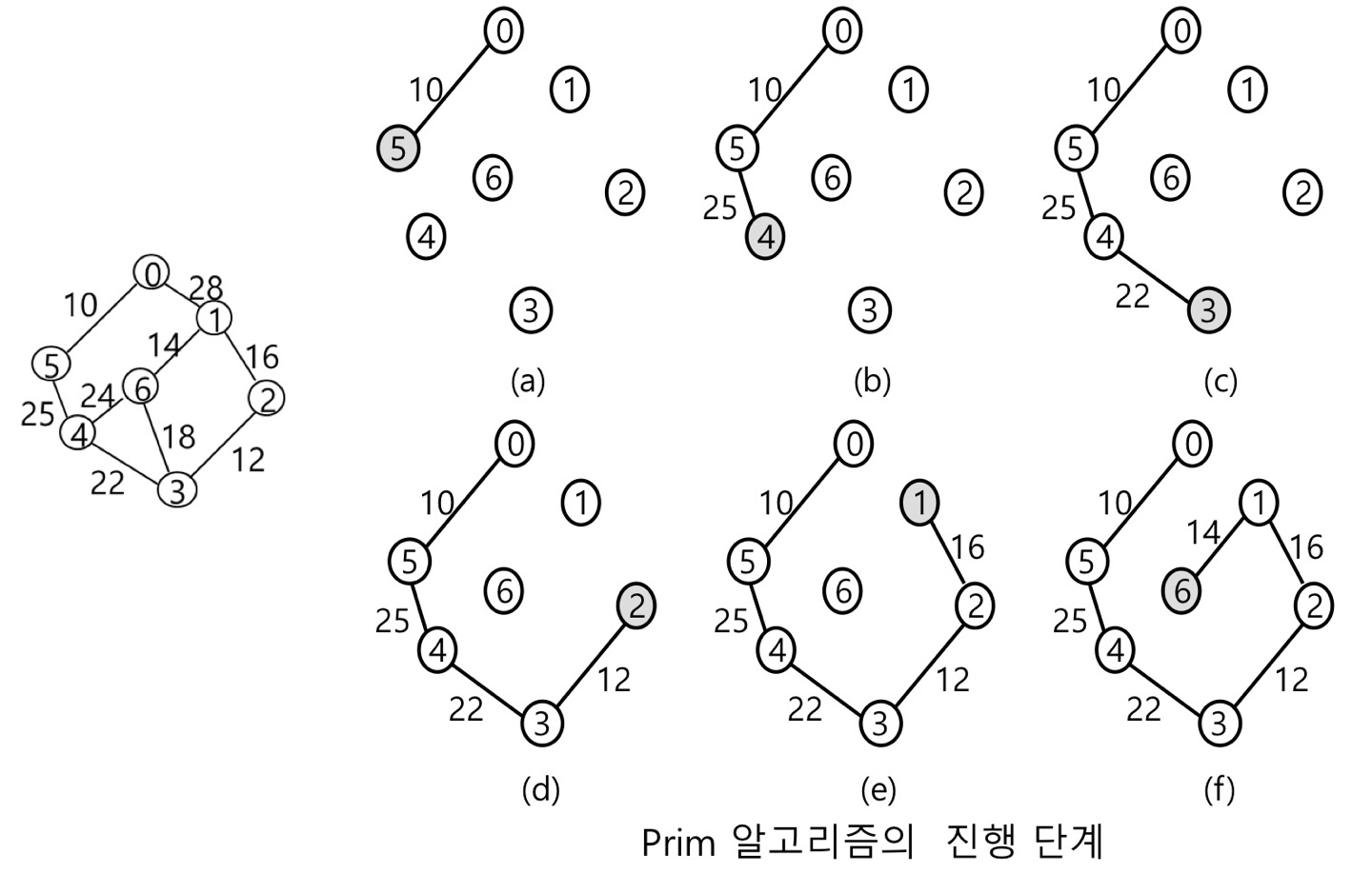 - 그래프에 n-1개의 간선이 포함될 때까지 추가 단계를 반복한다.