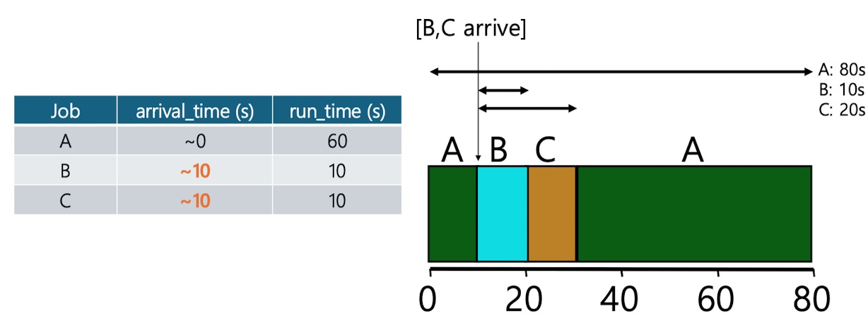 즉, 언제든 새로운 작업이 시스템에 들어오면, 이 스케줄러는 남아 있는 작업과 새로운 작업의 잔여 실행 시간을 계산하고 그 중 가장 적은 잔여 실행 시간을 가진 작업을 스케줄하는 것이다.