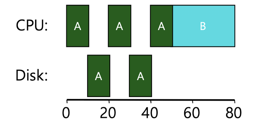 스케줄러는 위 그림처럼 A를 먼저 실행시키고 B를 다음에 실행시킨다. 이렇게 될 경우 A가 I/O하는 동안 CPU는 아무 작업도 하지 않게 되기 때문에 비효율적이다.