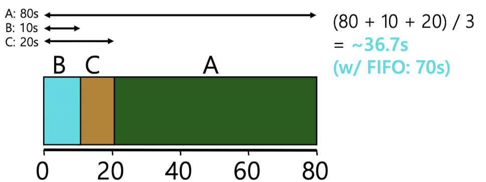 그러면 평균 반환 시간은 (80 + 10 + 20) / 3 인 36.7로 약 2배 정도 향상시킨 것을 볼 수 있다.