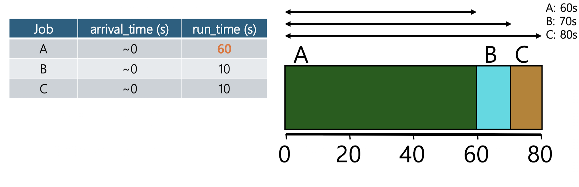 작업 A가 60초, B가 10초, C가 10초 동안 실행되는 것이다.