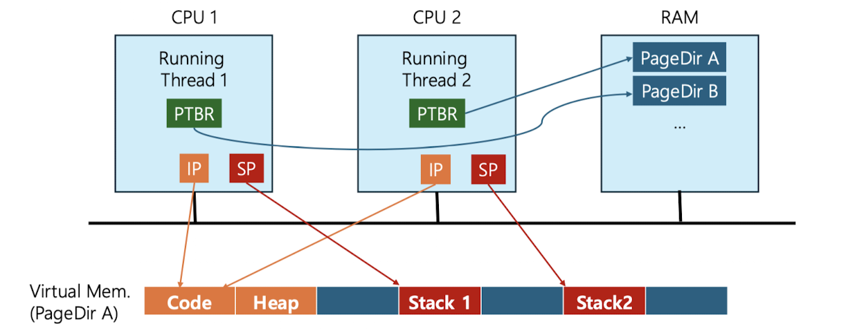 - 2개의 CPU안에 각각 스레드가 하나씩 돌아가고 있고, 각각의 PTBR은 서로 다른 Page Directory를 가리키고 있다.