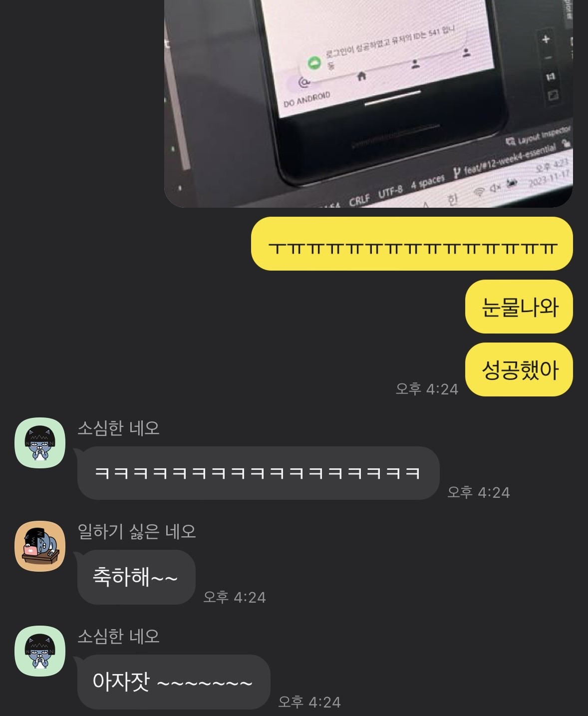 저 카톡을 할 당시, 서버 통신을 하면서 막막한 점이 많았는데 질문하자마자 도와주려고 달려와준 코조 덕분에 과제를 완수해낼 수 있었다,,