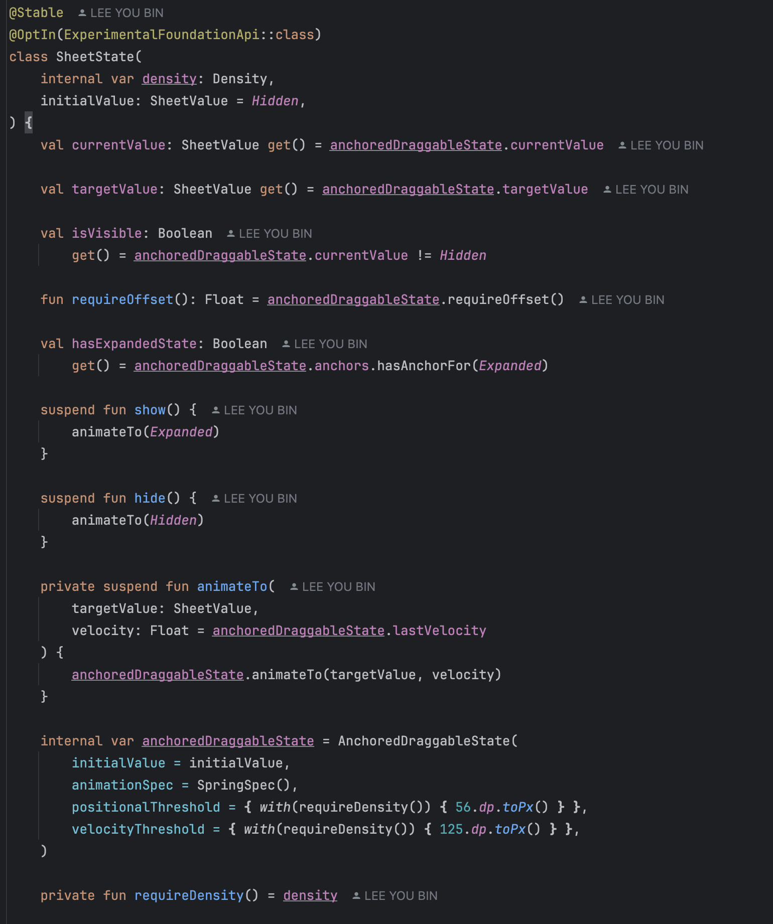 SheetState의 경우, 전체적으로 AnchoredDraggableState를 통해 내부적으로 관리되고 있다.