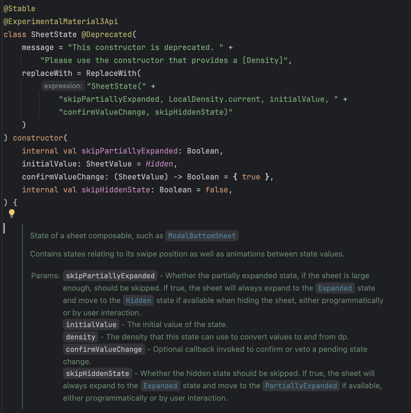 우선 Material은 rememberModalBottomSheetState를 통해 이를 호출하면 SheetState 객체가 생성되게 했다.