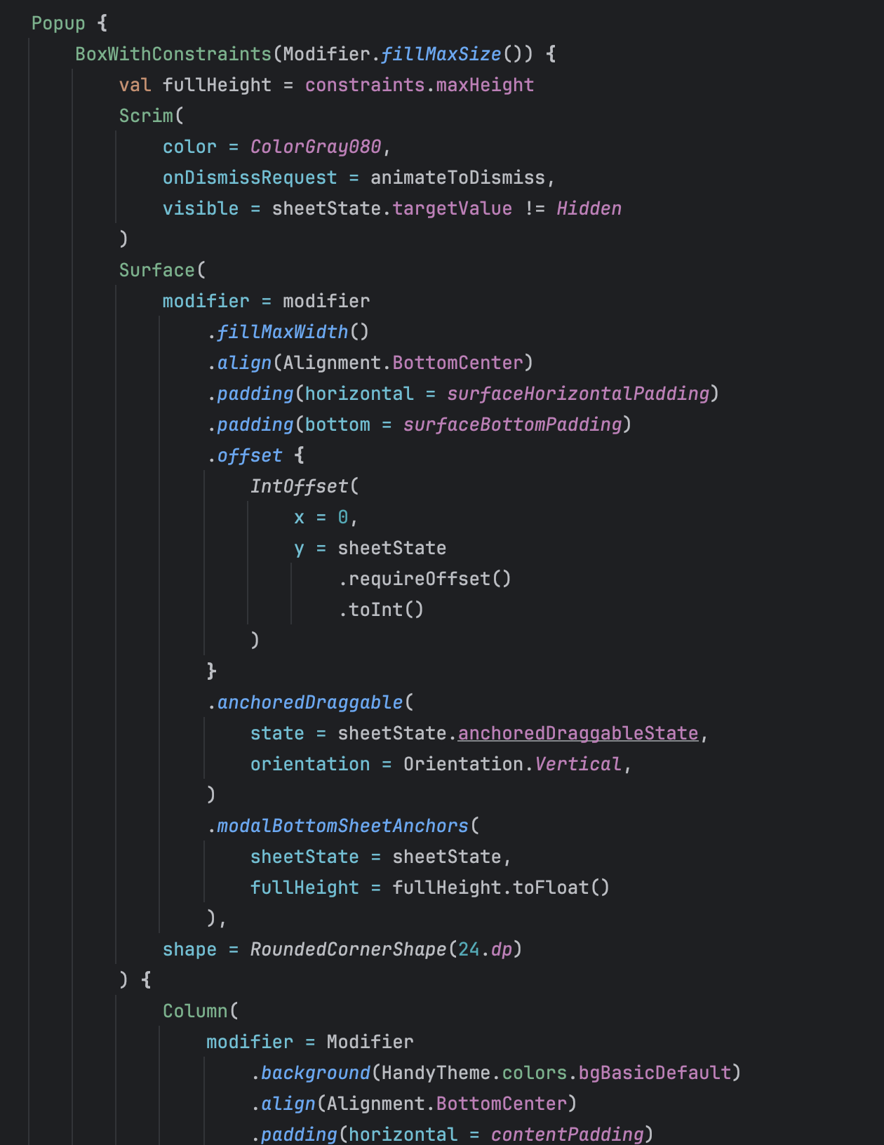 - Surface 안에는 드래그하는 핸들을 담당하는 dragHandle 컴포저블 함수와 슬롯으로 넣어준 content가 들어간다.